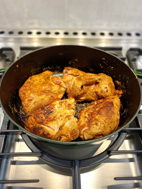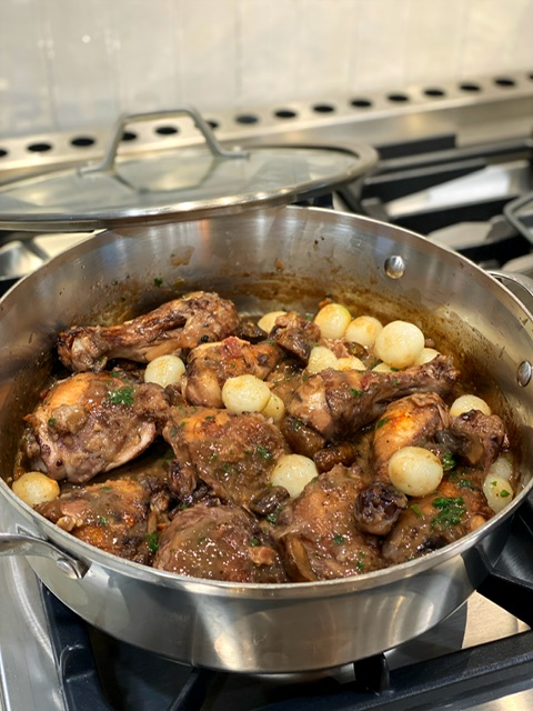 好みの赤ワインを惜しげ無くたっぷり使って煮込むチキンは、とろける柔らかさで、これも前夜からワインに漬け込んでおくのが大事。