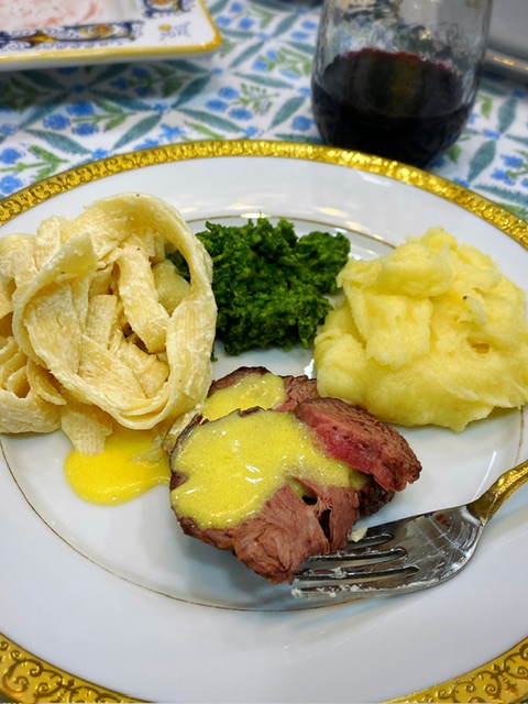 テンダーローイン(ヒレ肉)と言っているが、その中央のシャトーブリアンの部分だけをローストする、とても贅沢なメインディッシュだ。6、7年前までは、テンダーローイン1本が$70とかそのくらい済んでいたのだが、今年は驚きの$160。😭 この伝統、いつまで続けていけるのか笑