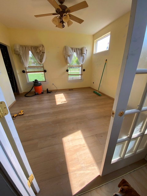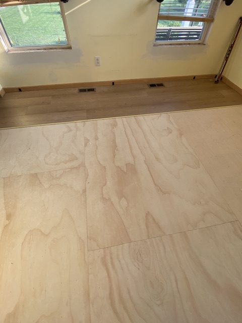 先ずは、古いカーペットを剥がし、床の貼り替えを職人さんがしてくれた。 まずはベースボードを貼って。