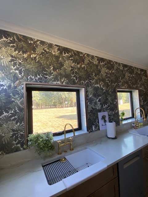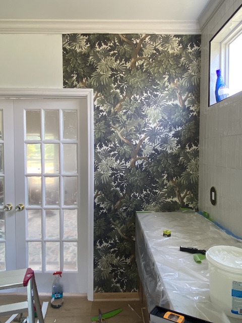 キッチンがほぼ完成したので、ようやく壁紙を貼れるようになった。
